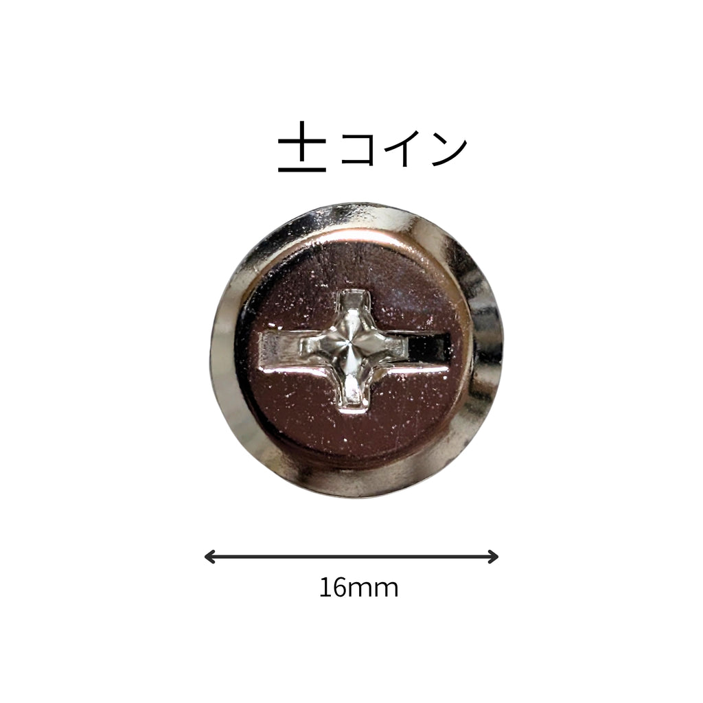 頭径16mm・頭厚2.3mmの広い座面で部材をしっかり固定し、仕上げは鉄製・ニッケルメッキまたはGBメッキから選択可能